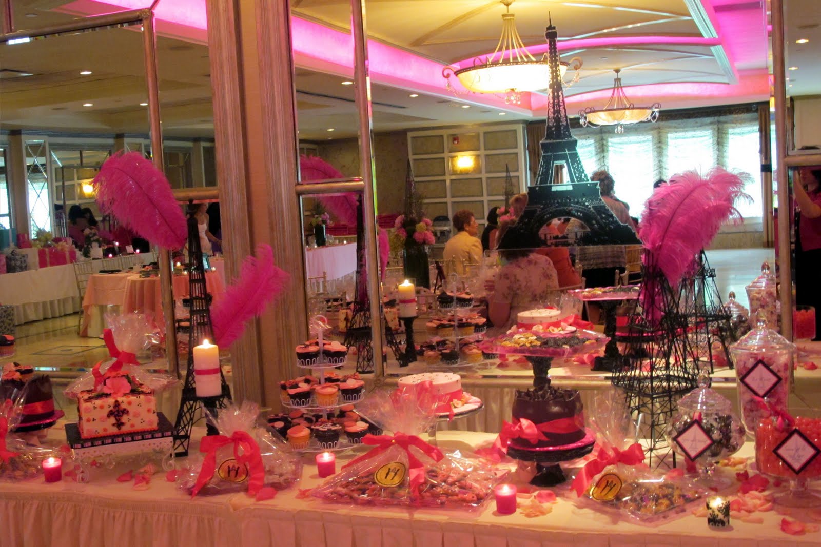 After three yummy courses and piles of amazing gifts, an incredible dessert bar awaited! Overflowing with fleur de les cupcakes, chocolate truffles, Eiffle Tower cookies, and assorted pink confections, the twenty foot spread was a show stopping display.